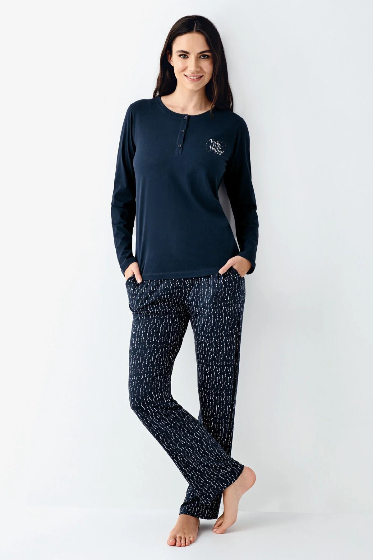 Arnetta 3429 Kadın Lacıvert Uzun Kollu Yarım Pat Bisiklet Yaka Pijama TakımıKadın Pijama TakımıArnetta