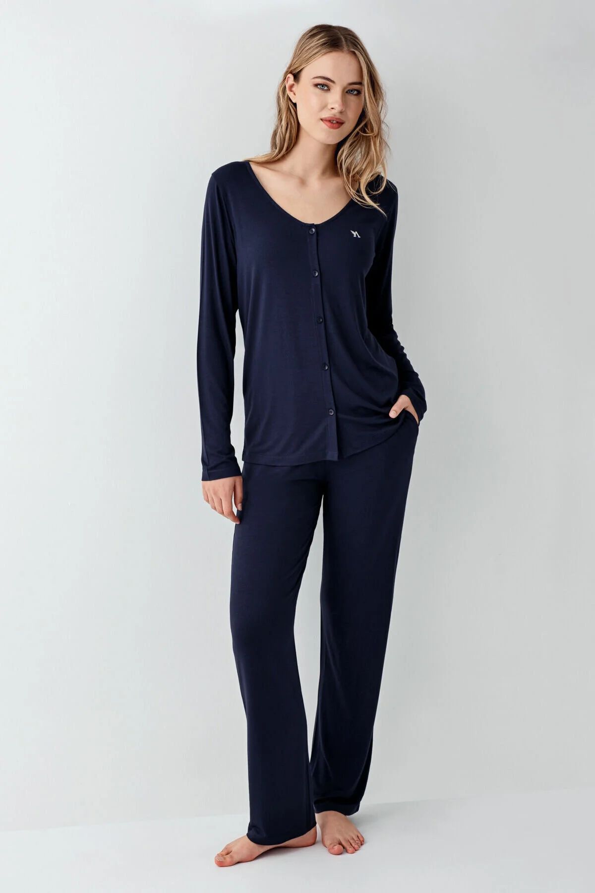 Arnetta 3460 Kadın Lacıvert Uzun Kollu Önden Düğmeli Geniş V Yaka Pijama Takımı